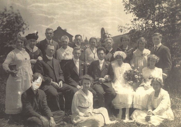 Second row: Aunt Annie (dad’s sister) [Annie Eliza Barrow Burt-Gerrans], minister, best man, Sid [Sidney Scott], Lena [Lena May Burt], sister Gladys.