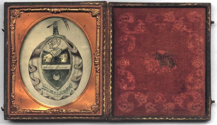 The small leather bound Coat of Arms passed down in the family bearing the name “John Given”. The exact origin is still unknown, but the case is a typical Victorian "6th plate" size Daguerreotype wooden case with decorative leather cover and velvet interior with a brass matte, dating from the 1840's or early 1850's. This was likely the case borne by John Given as referred to on the description of the large painted replica hanging in the Moncton Museum.