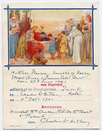 A scan of her original baptismal certificate (listing Matilda Burt, her grandmother, as a sponsor).