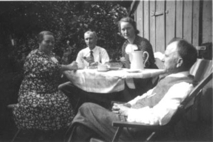 Afternoon tea with, from left to right, Ida Weber Liese (Karoline’s older sister), her husband Bernhard Liese, Karoline and husband Bruno. The Liese’s visited Kiel each year and are here seen at the Frankes’ garden in front of the cottage/shed built by Bruno, walking distance from where they lived.